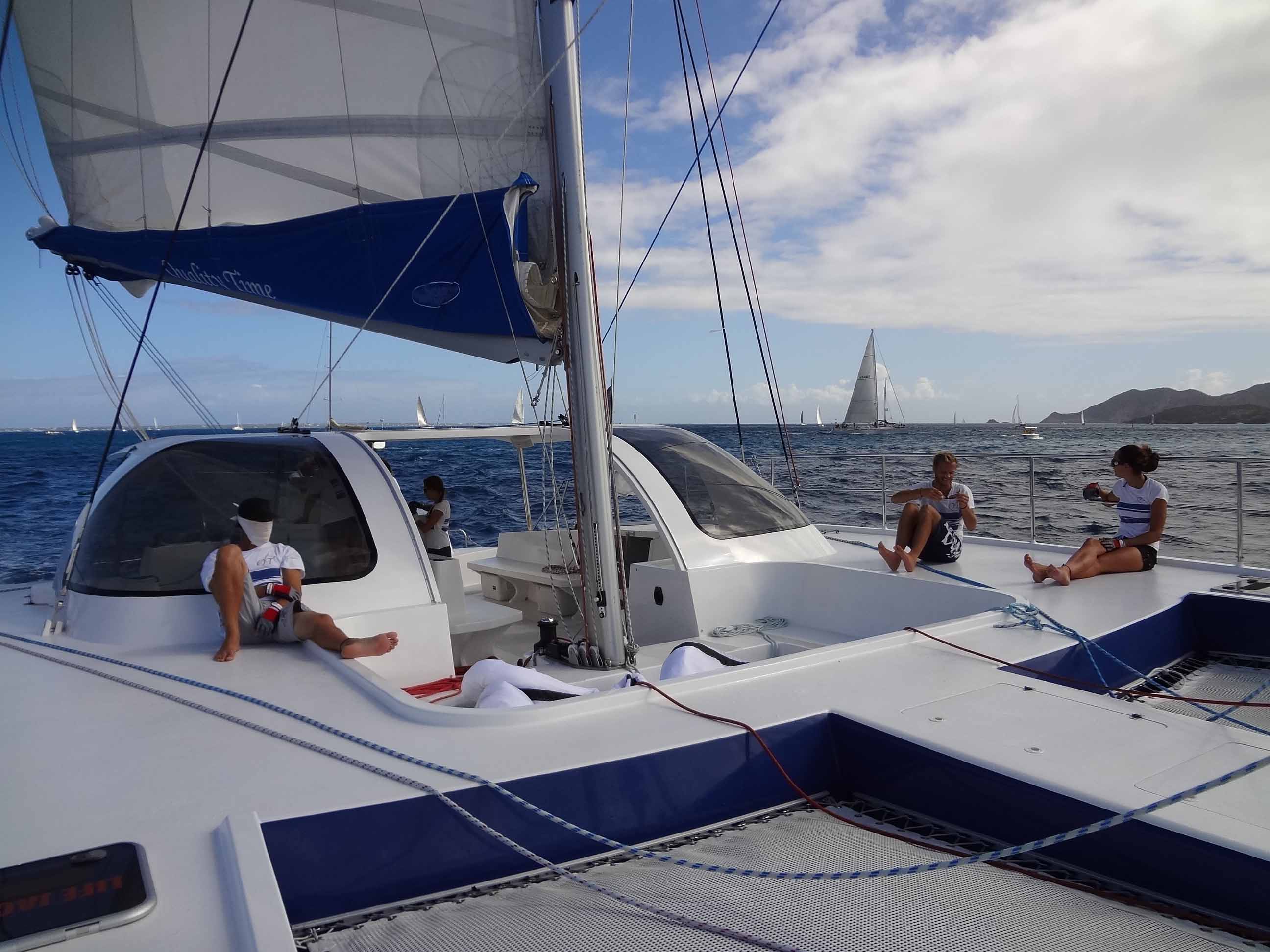 It takes our crew about two hours to clear all the charter gear and set up for competitive racing. And competitive she is! In the past year we have chalked up a number of first places and had very close racing with the top boats. In the recent Heineken Regatta we were racing boat-for-boat with a 66 foot Gunboat and were within a whisker of beating her. Pretty cool going with Dacron working sails…maybe time to gear up!